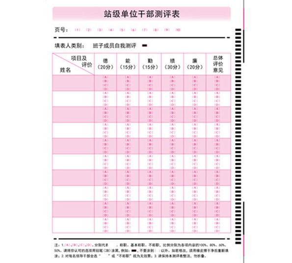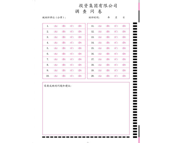 答題卡(又稱(chēng)信息卡),是光標(biāo)閱讀機(jī)輸入信息的載體,是配套光標(biāo)閱讀機(jī)的各種信息錄入表格的總稱(chēng)。信息卡將用戶(hù)需要的信息轉(zhuǎn)化為可選擇的選項(xiàng),供用戶(hù)涂寫(xiě)。OMR設(shè)備根據(jù)信息點(diǎn)的涂與未涂和格式文件設(shè)置將信息還原。