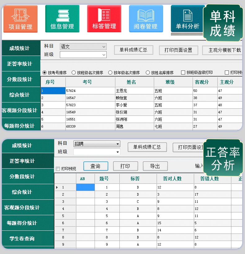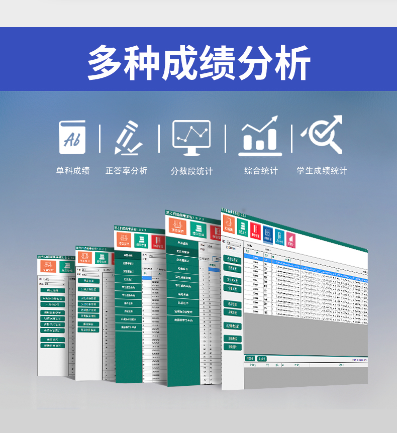 30、具有正答率統(tǒng)計(jì)、分題段統(tǒng)計(jì)、分?jǐn)?shù)段統(tǒng)計(jì),每題得分、單科成績、多科統(tǒng)計(jì)、班級名次、年級名次,缺考違紀(jì)名單統(tǒng)計(jì)、歷次成績統(tǒng)計(jì)、成績分析等等