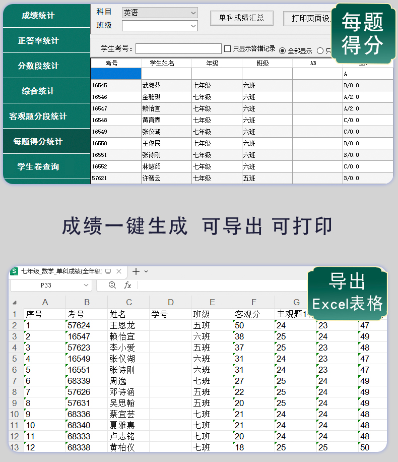 31、*具有綜合統(tǒng)計(jì)報(bào)表功能;把年級的考試人數(shù)、*高分、*低分、平均分、**人數(shù)、**率、及格率、低分人數(shù)、低分率、正答率統(tǒng)計(jì)和每個人的分?jǐn)?shù)班級年級排名,缺考違紀(jì)綜合一個表進(jìn)行打印和導(dǎo)出功能。